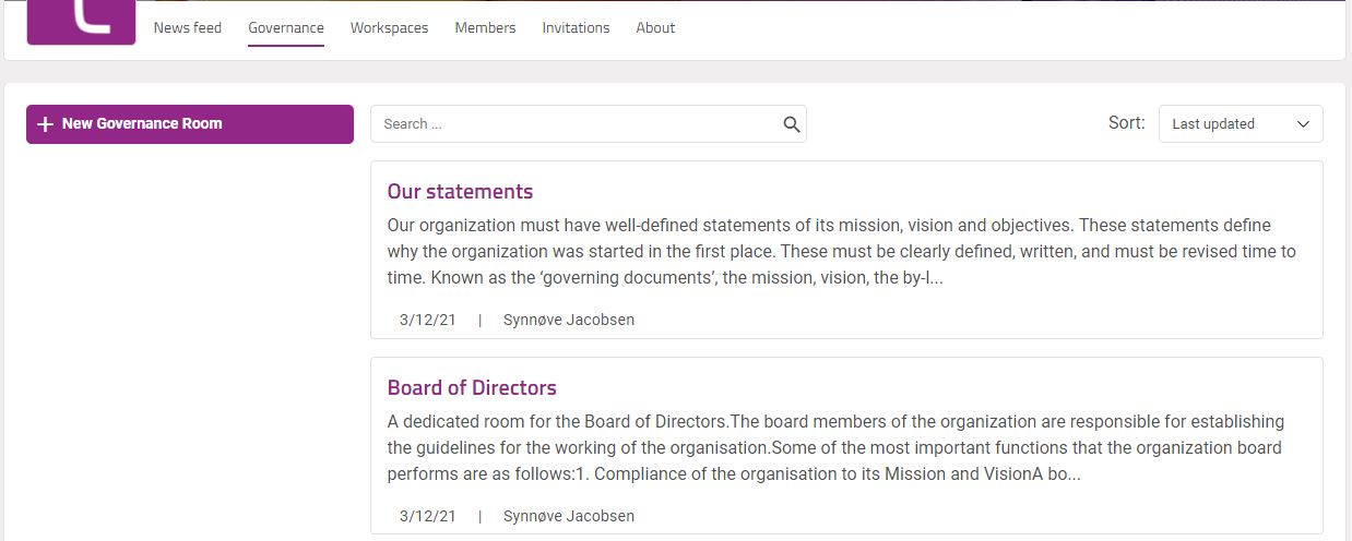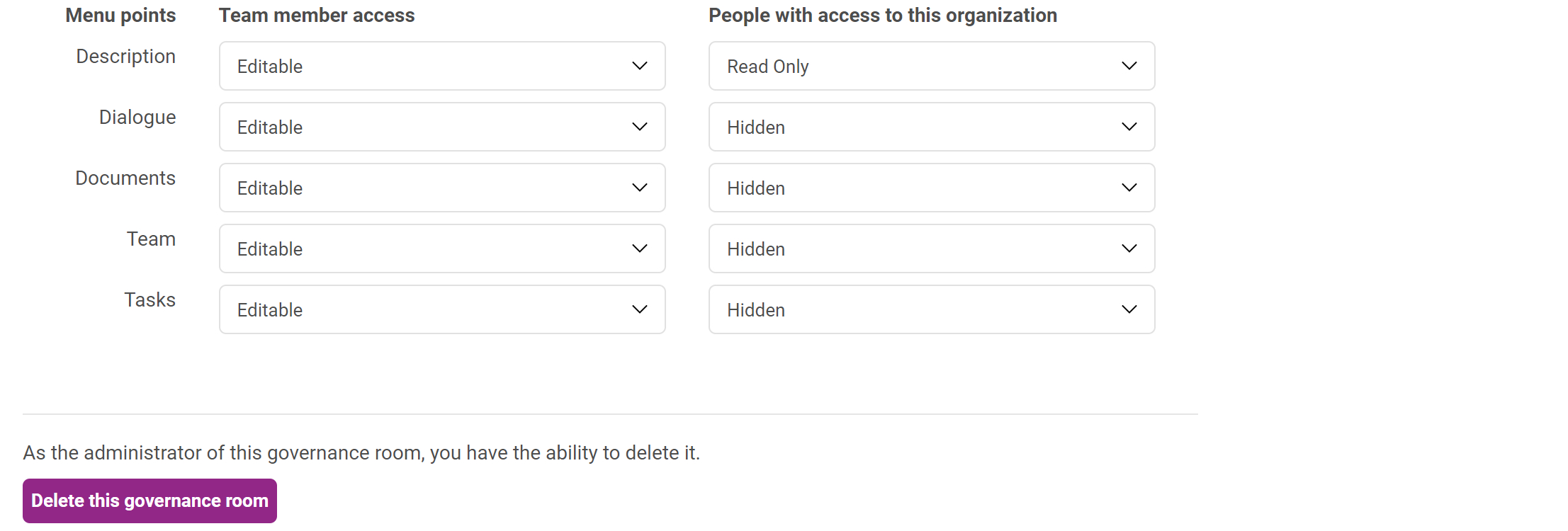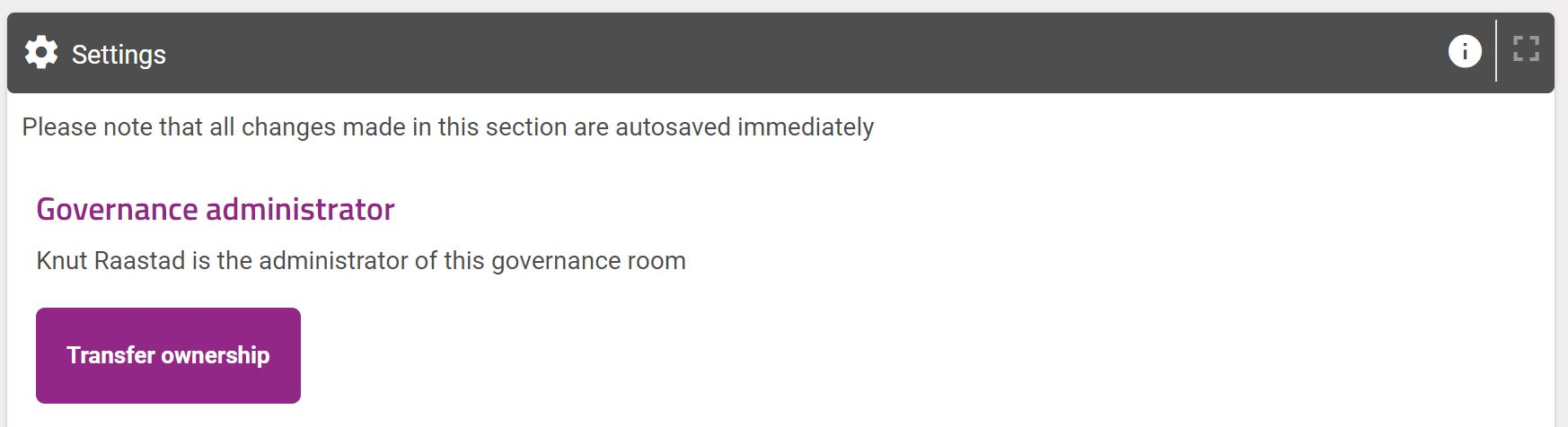 In the settings you decide who has access to administrate this governance room, and what the team members and organization members have access to. You will also be able to transfer administration to another person. You may also delete the governance room from settings.