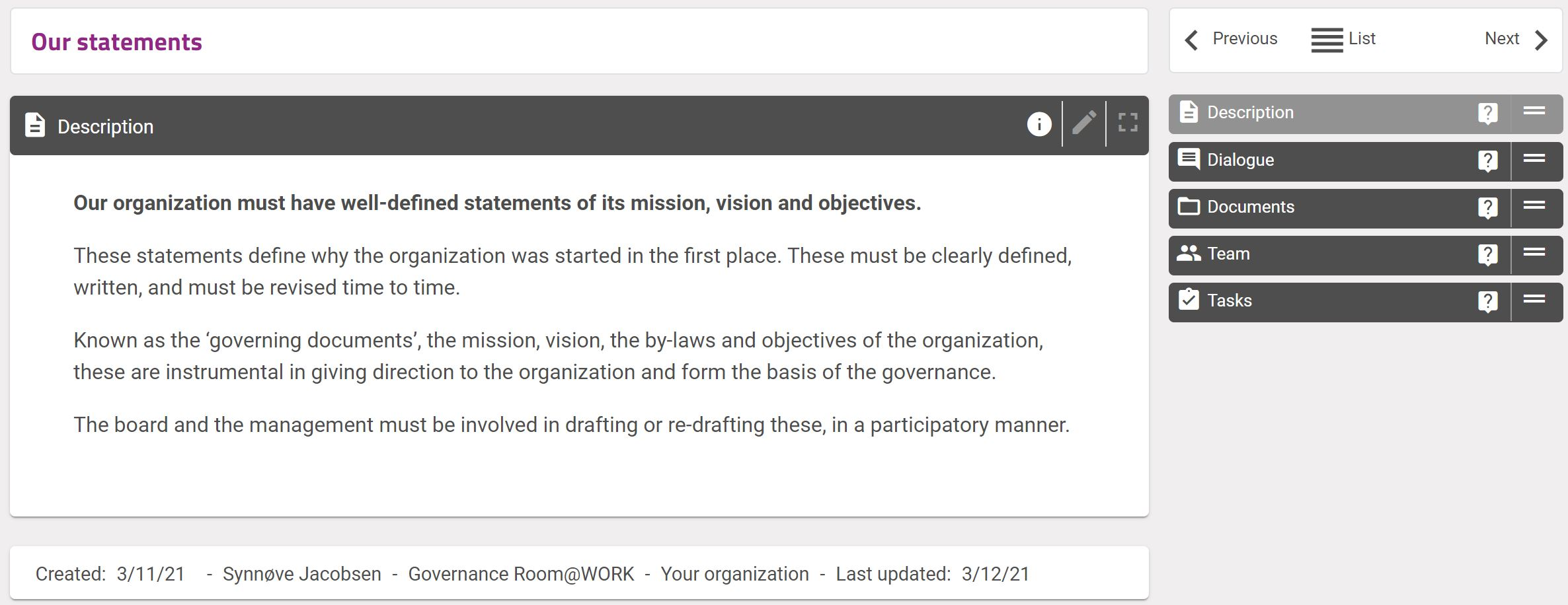 The description is to describe what this governance room is about and include information that you think is useful for you team members, and others that can see and access it. To edit the description, simply click on the pencil in the top right hand corner in the grey header. You can use formatting and add images and videos to make the page both informative and pretty.