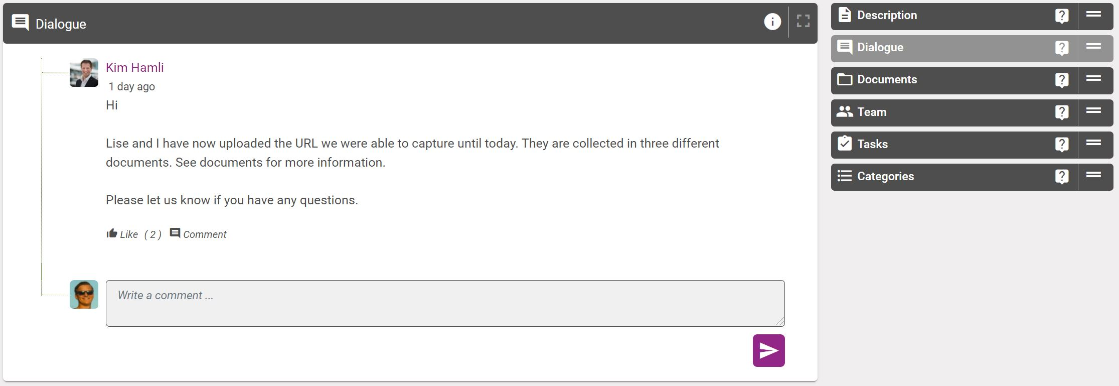 This is where team members and any externals that you have given access can share information and discuss. Like facebook, linkedin, Instagram and other social media platform, you can comment, like and comment on other comments.