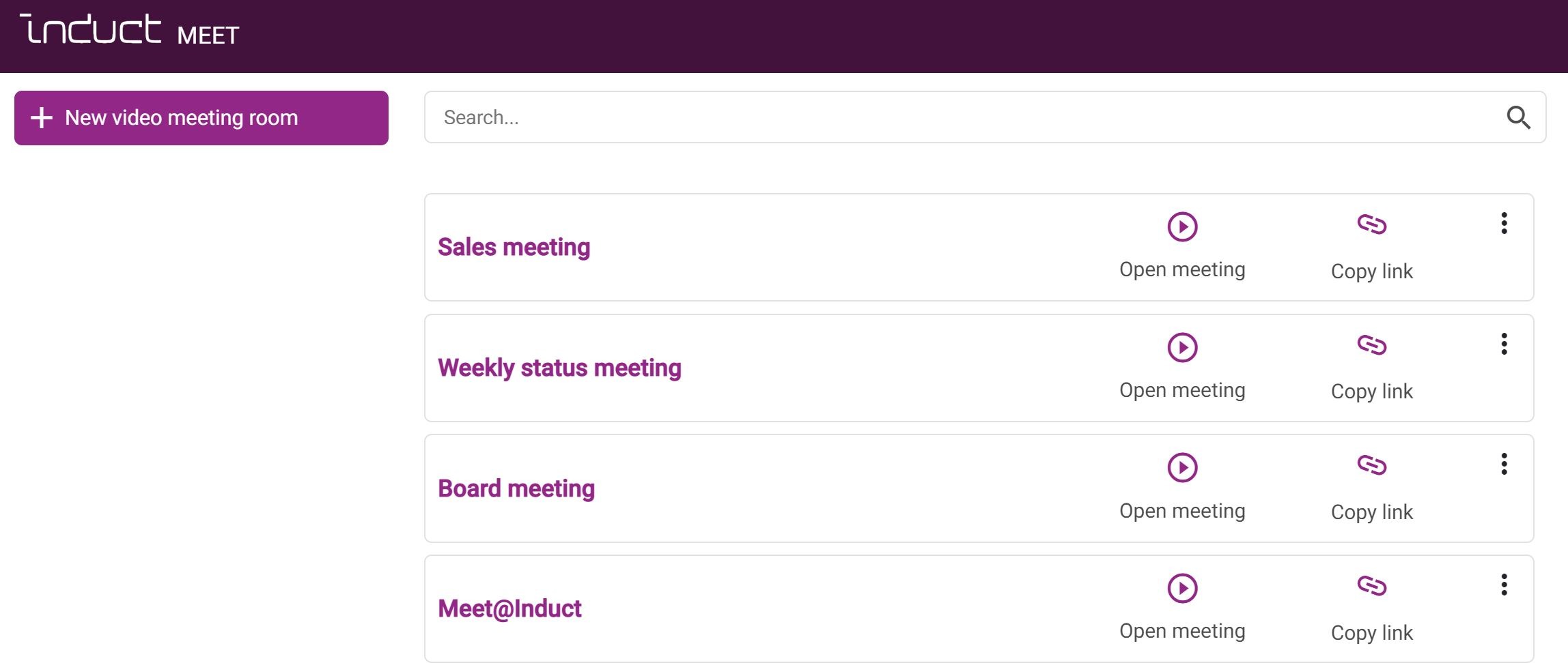 Access video meetings by clicking on the meet icon on the purple menu-bar. Video meetings will then open in a new tab.