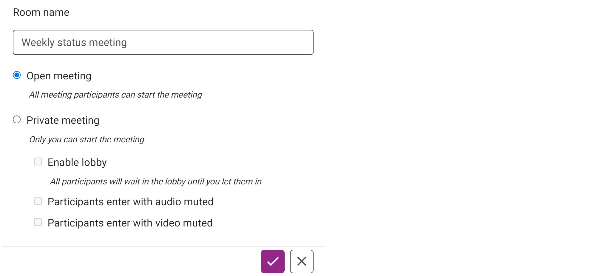 - Give your meeting room a name and decide if you want it to be an open meeting that any participant can start or a private meeting that only you, the meeting host, can start. Choose the options that works best for your meeting, and remember to save.