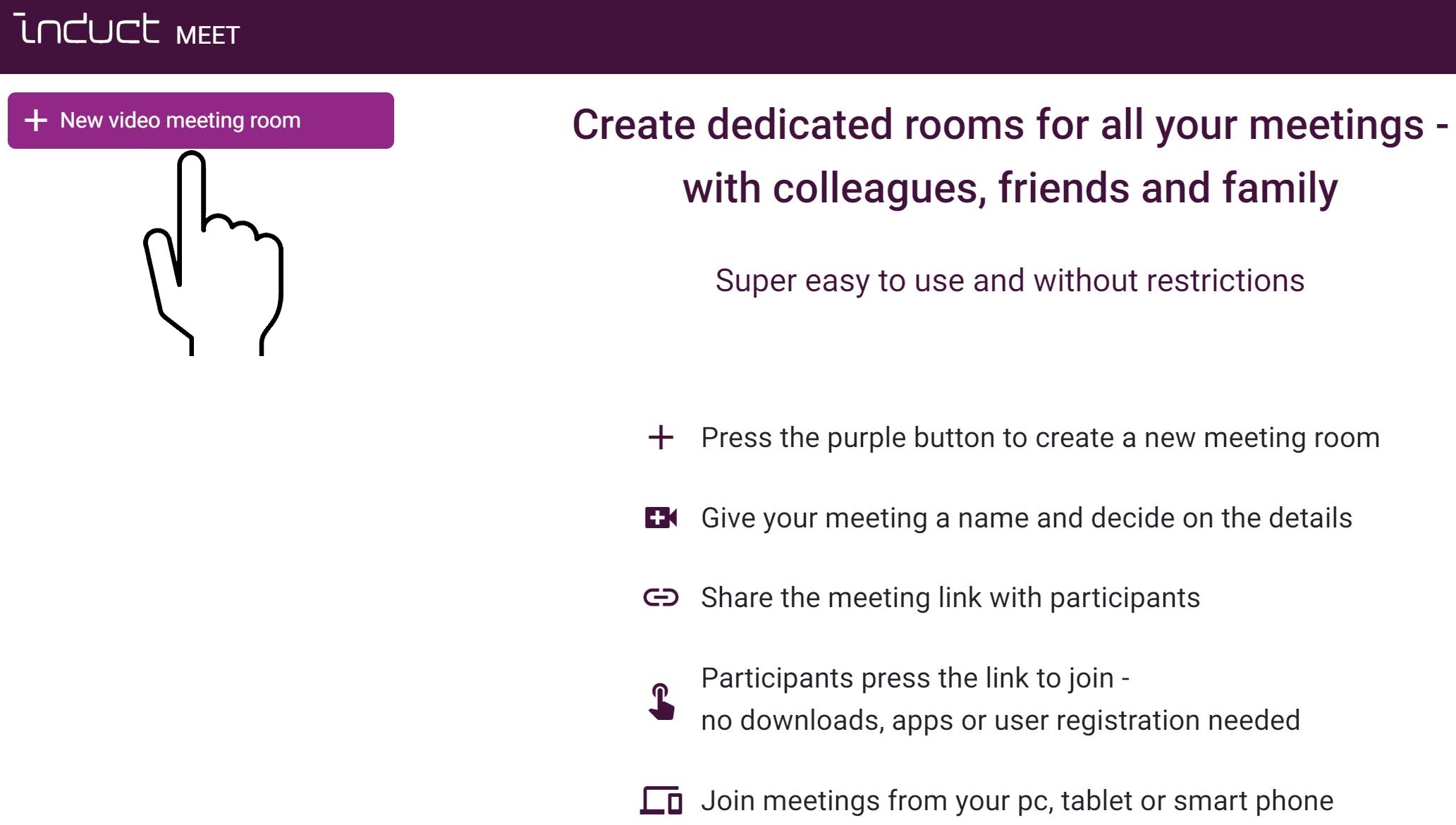 - To invite others to a meeting, copy the meeting link and send it to participants or add it to an email invitation, chat or a workroom in Induct. Those you invite do not need an Induct user account to participate in meetings. All they have to do is click on the meeting link.